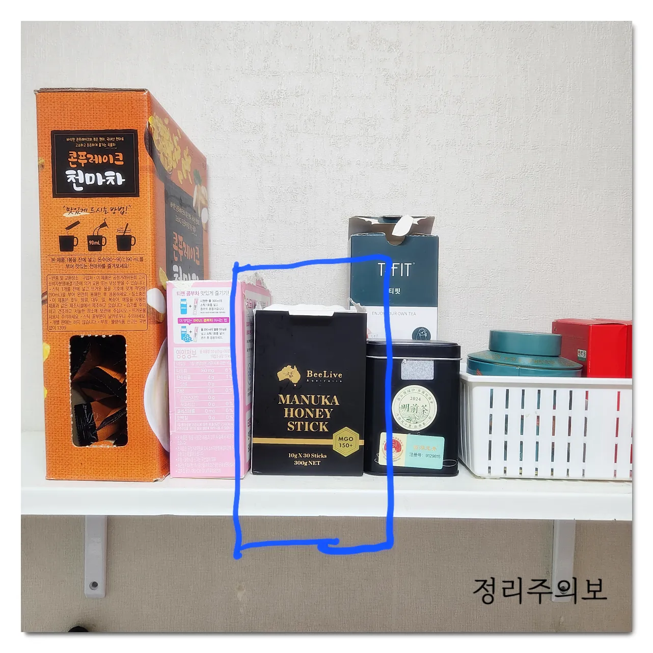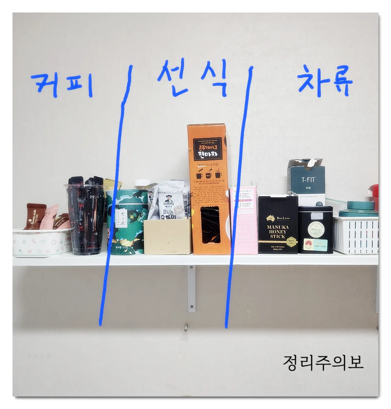 저 같은 경우는 '음료'라는 큰 종류를 세분화시켜서 차, 커피, 선식 이렇게 세 가지로 나눴습니다. 특히 벽선반은 손이 많이 가는 용품들이 올라오는데, 종류 세분화까지 해놓으면 시너지가 더 커진답니다!